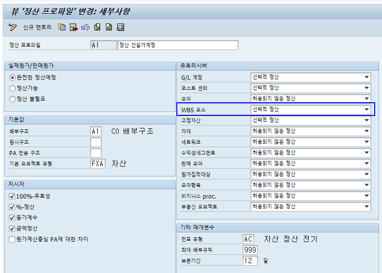 WBS 요소 -> 선택적 정산으로 변경 후 저장